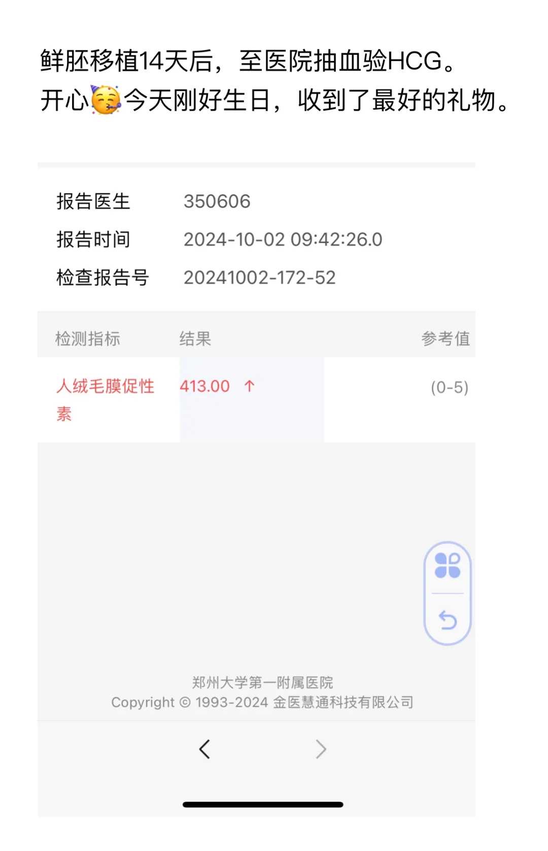 超级超级开心的哇😁移植后第九天可以通过血液检测(血清HCG水平)确认妊娠,HCG上升100+较稳,隔天再测,HCG水平应该加倍,这种增长是正常妊娠的良好指标。去中心做血检时,心里无数次地问自己:如果真的有了,那会是怎样的幸福???出血检结果时,当大白微笑着走进来,告诉我们结果的时候,简直不敢相信自己......
